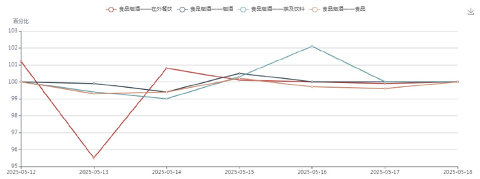 本周,食品烟酒大类周指数环比下降1.5%。中类层面,在外餐饮中类周指数环比下降2.2%,是本周食品烟酒大类价格下降的主要来源。