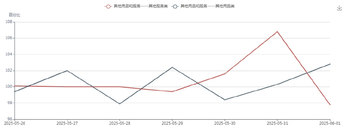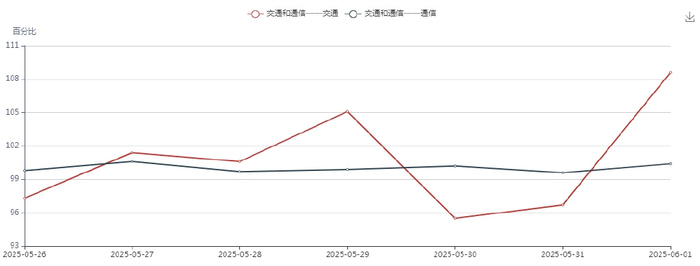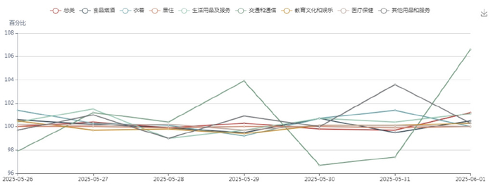 本周各大类日指数波动幅度较大。交通和通信在6月1日涨幅达6.6%,下设交通中类在6月1日涨幅最大达到8.6%。