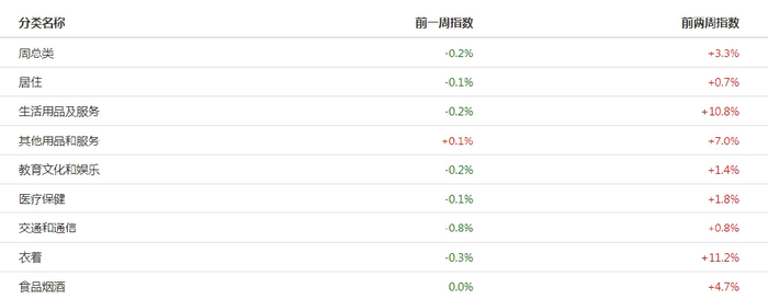 具体看小类层面,交通中类下设各小类均呈现不同程度的周环比下跌,其中交通费价格周环比下跌2.3%。