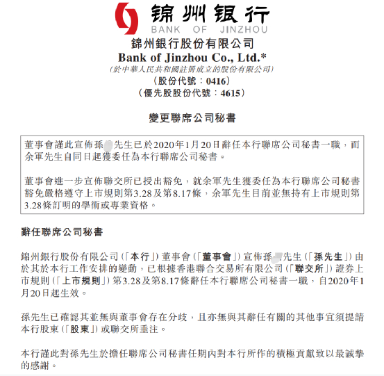 2020年1月,锦州银行发布公告称,其董事会宣布孙某由于该行工作安排的变动,辞任联席公司秘书一职,自2022年1月20日起生效。彼时锦州银行表示,孙某确认其与董事会并无分歧,且无与其辞任有关的其他事宜需关注。