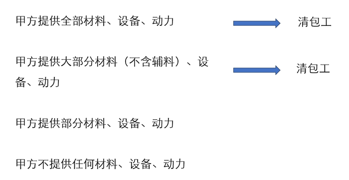 我们按甲方,也就是发包人,提供的材料的多少,分成四类,甲方提供全部材料、设备、动力,甲方提供大部分材料(不含辅料)、设备、动力,甲方提供部分材料、设备、动力,甲方不提供任何材料、设备、动力。甲方提供的,乙方可以不用再提供;甲方不提供的,就需要乙方自己提供。前两类,承包人不需要采购材料或只需要采购辅助材料,就属于清包工。也就是说,清包工属于甲供,甲供却不一定是清包工。这就是清包工与甲供的区别。