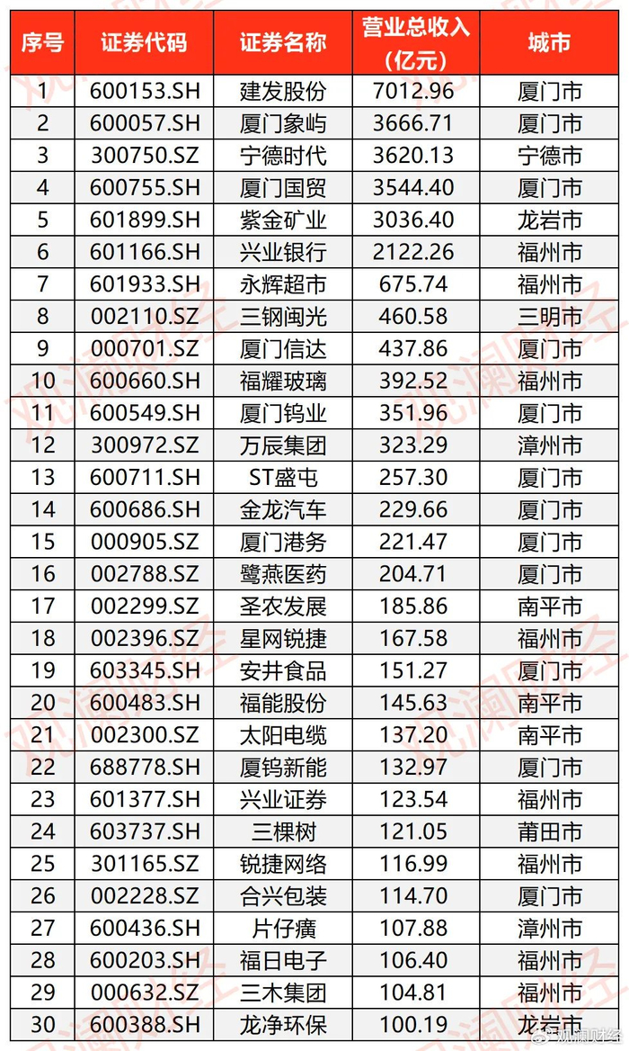 2024年,福建省共有30家A股上市公司实现百亿以上营收。营收榜上,建发股份、厦门象屿、宁德时代位列前三,建发股份营业总收入达到7012.96亿元。厦门象屿、宁德时代、厦门国贸、紫金矿业营业总收入超3000亿,兴业银行营业总收入超过2000亿。
