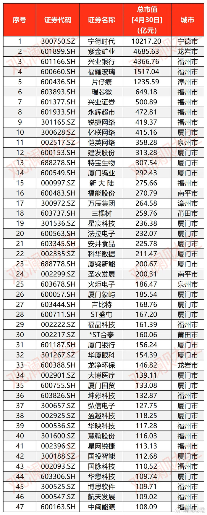 截至2025年4月30日,共有47家福建A股上市公司总市值超过百亿元,相比去年同期【观澜财经】所统计的37家,整整增加了10家。其中,厦门有20家企业总市值超百亿,较去年同期增加2家。