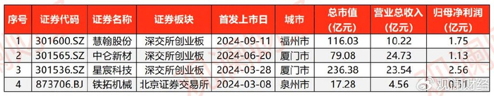 2024年,福建共有4家公司在A股上市,首发募资总额达22.64亿元。新增的A股上市公司中,包括深交所创业板3家(慧翰股份、中仑新材、星宸科技)、北交所1家(铁拓机械)。四家2024年营业总收入合计63.04亿元,合计归母净利润5.96亿元。