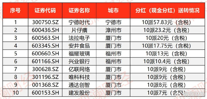 宁德时代分红方案断层领先之下,片仔癀现金分红方案为每10股派发23.2元,合计派现金额6.94亿元。