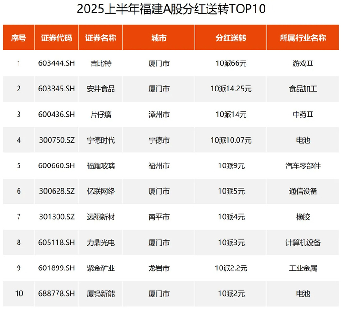 截至目前,福建辖内共有27家A股上市公司宣告2025年中期分红,共拟分红165.01亿元。其中,分红最慷慨的依然是吉比特,而从派发总额来看,紫金矿业分红最多。