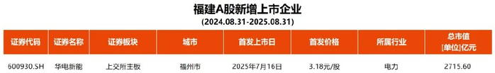 今年以来,福建A股上市队伍仅新添加一位新成员,来自福州的华电新能(600930.SH)也发布了首份半年报。华电新能(600930.SH)在7月16日正式登陆上海证券交易所主板,华电新能发行价为3.18元/股,超额配售选择权全额行使后的发行股数为57.14亿股。
