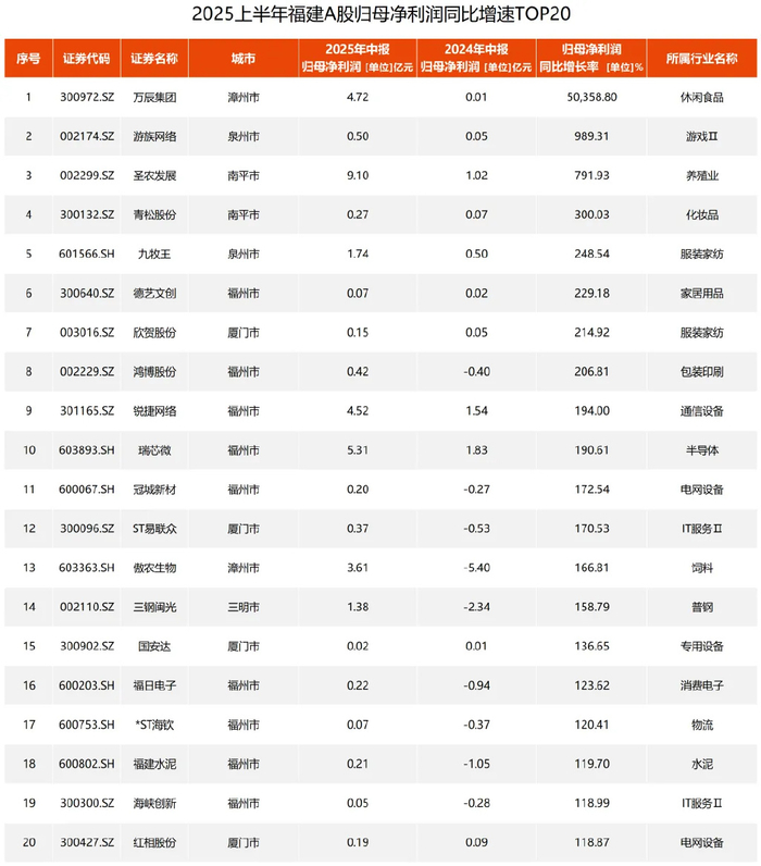 归母净利润同比增速榜单,同样存在“小基数”造就“大增速”的情况。整体来看,上半年万辰集团(300972.SZ)、游族网络(002174.SZ)、圣农发展(002299.SZ)三家企业归母净利润增速超500%;青松股份(300132.SZ)、九牧王(601566.SH)、德艺文创(300640.SZ)、欣贺股份(003016.SZ)、鸿博股份(002229.SZ)等5家企业归母净利润增速均在200%以上;共有25家福建A股上市公司归母净利润增速超100%。