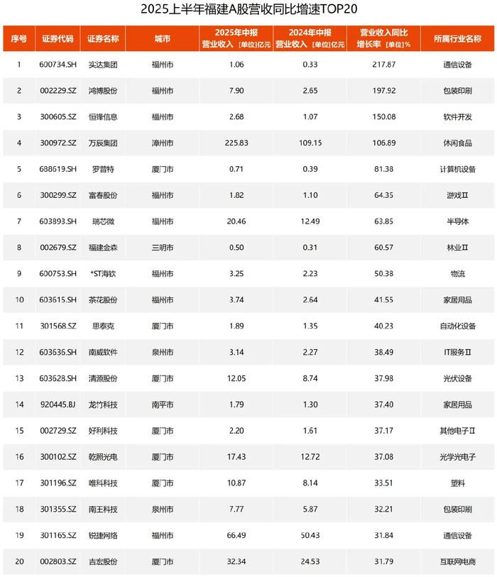 2025年上半年,福建A股上市公司的整体经营业绩保持稳定增长态势。Choice数据显示,173家福建A股上市公司(*ST紫天除外)实现营业收入共计15589.47亿元,同比下降0.86%;归母净利润共计1338.15亿元,同比增长18.76%。