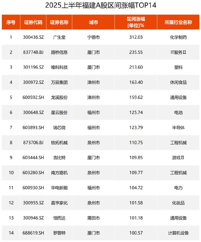 其中,广生堂(300436.SZ)以313.03%的区间涨幅位居福建A股第一,其次路桥信息(837748.BJ)、唯科科技(301196.SZ)、万辰集团(300972.SZ)、龙溪股份(600592.SH)四家企业的区间涨幅分别达235.55%、213.60%、163.40%、159.62%。