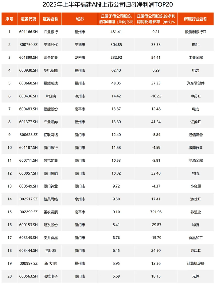 在净利润方面,2025年上半年度有12家福建A股上市公司的归属母公司股东净利润超10亿元。兴业银行(601166.SH)蝉联福建A股上半年最赚钱的企业,归属于母公司股东的净利润达431.41亿元。