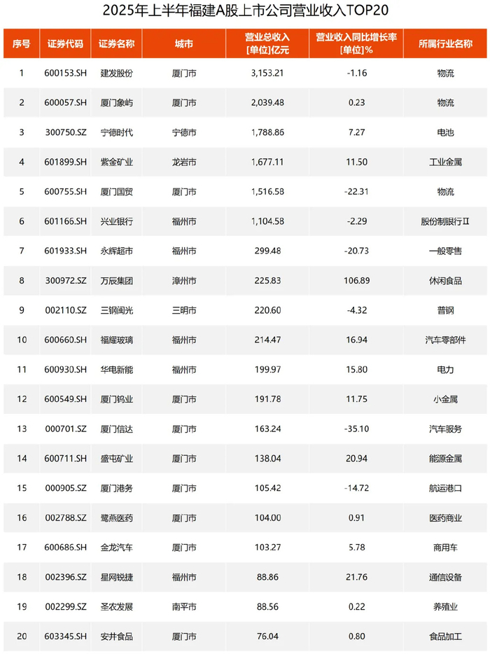 根据福建A股企业半年报数据显示,目前福建千亿营收俱乐部成员共有6家,依次为建发股份(600153.SH)、厦门象屿(600057.SH)、宁德时代(300750.SZ)、紫金矿业(601899.SH)、厦门国贸(600755.SH)、兴业银行(601166.SH)。