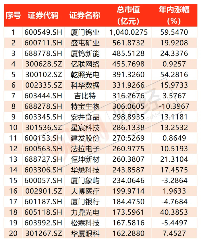 经历这一轮市值增长之后,厦门上市公司的市值座次也发生变化。Choice数据显示,盛屯矿业(600711.SH)当天收于18.18元,最新总市值为561.87亿元,年内涨幅近20%,排名第二。厦钨新能(688778.SH)26日的收盘价达到96.2元,最新总市值来到485.51亿元,年内涨幅超过24%,排名第三。