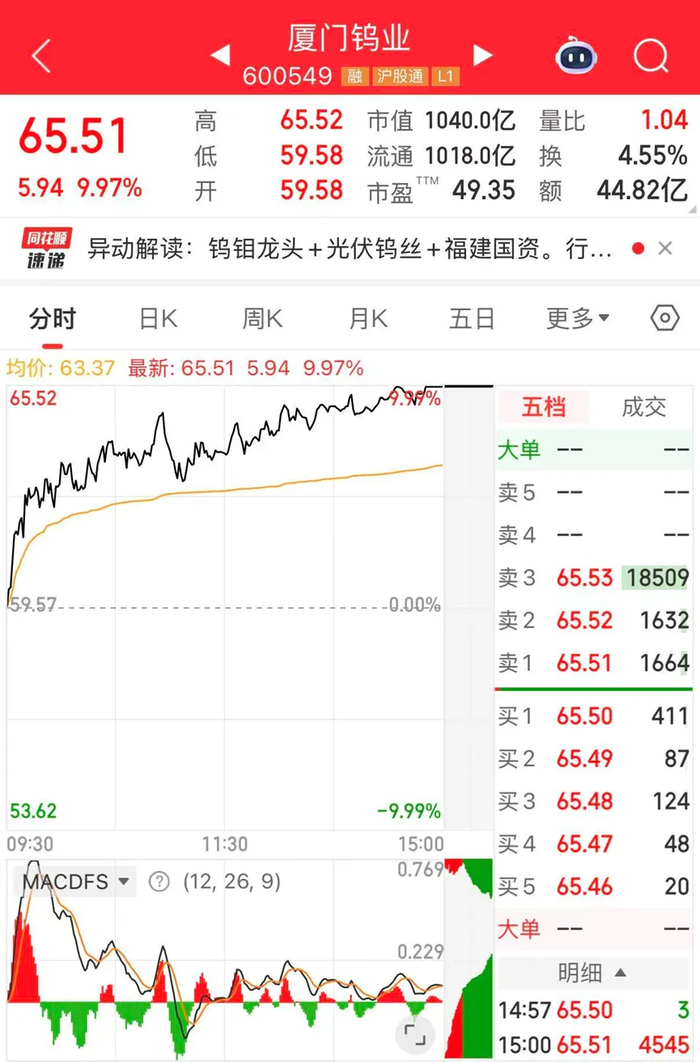 1月26日,厦门钨业(600549.SH)收涨9.97%,股价达到65.51元。按照公司总股本15.88亿股计算,厦门钨业总市值达1040.03亿元,成为厦门辖区首家总市值破千亿的上市公司。
