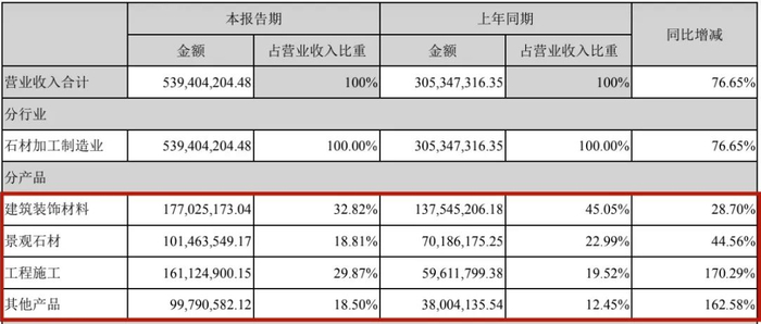 ▲图片来源:万里石2021半年报据年半年报披露数据显示,万里石的主营业务主要包括:建筑装饰材料、景观石材、工程施工以及其他产品四大类。其中建筑装饰材料实现营收1.77亿元,同比增长28.7%;景观石材实现营收1.01亿元,同比增长44.56%;其中工程施工与去年同期相比增长幅度最大达170.29%,占上半年营收比重三成。从业务结构来看,“建筑装饰石材”依旧是万里石营业收入的主要来源。