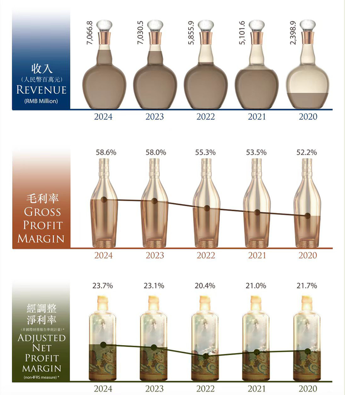 ▎珍酒李渡主要经营指标特别是行业普遍降速的2024年,珍酒李渡除营收和经调整净利润双增外,产品毛利率58.6%(以A股会计准则计算为75.5%,与行业持平),经调整净利率23.7%,同比均提升0.6个百分点,盈利能力持续增强。产品和渠道层面,次高端产品收入增长8.8%,经销商收入同比增长2.1%。