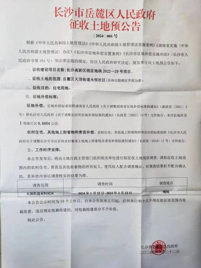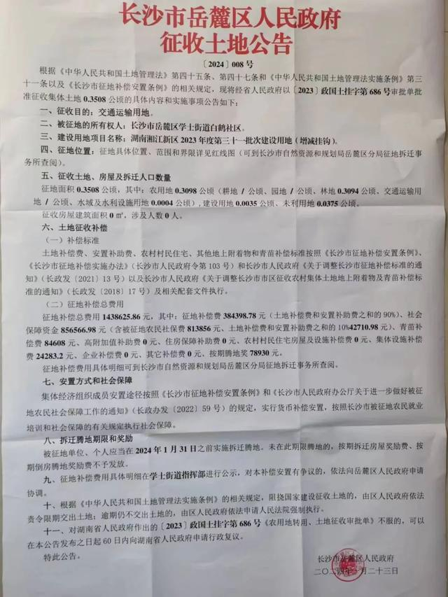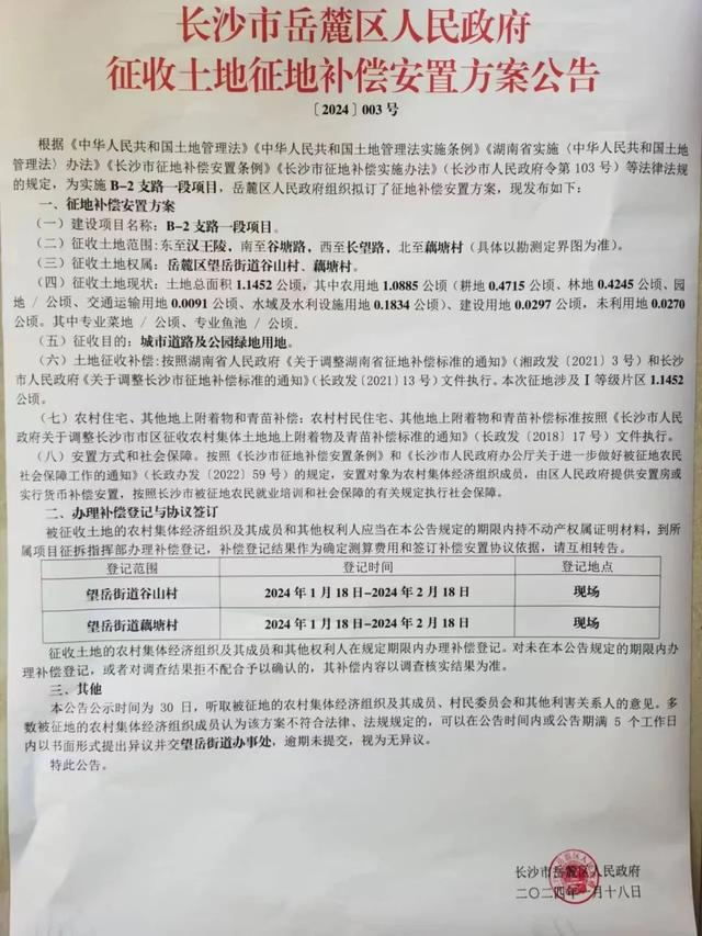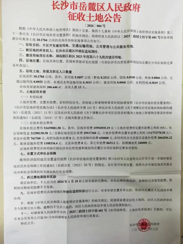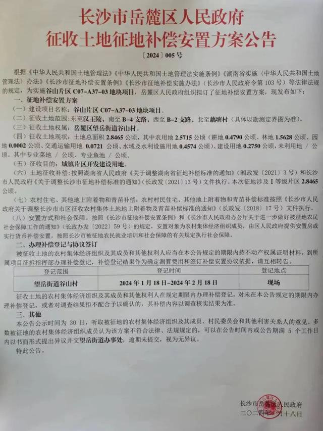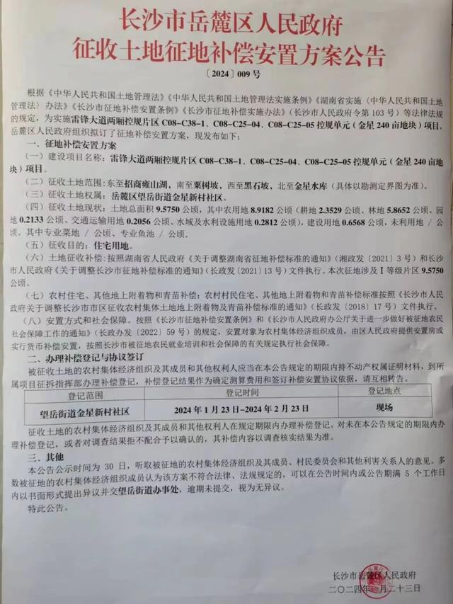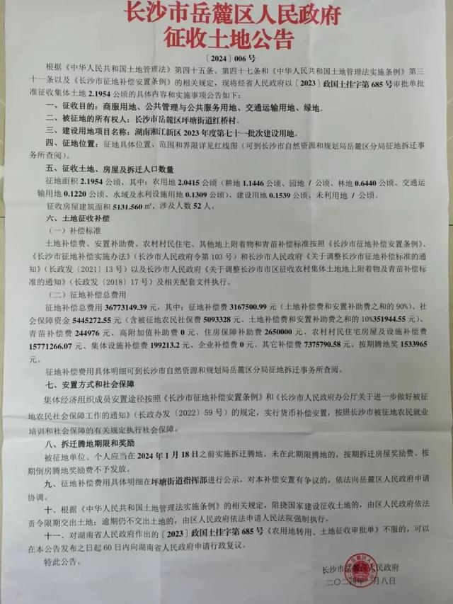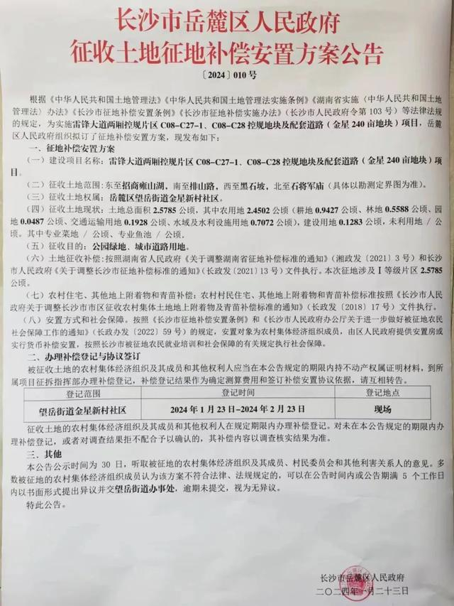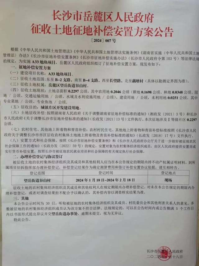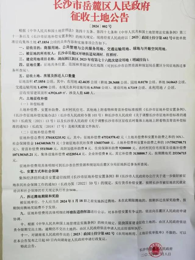 1月18日湘江新区(岳麓区)发布8则土地征地补偿安置方案公告、1则征收土地公告、1则征收土地预公告;