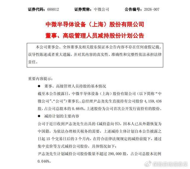中微公司发了个公告,公司董事长尹志尧(81岁)拟减持所持股份,涉及金额约一亿元。