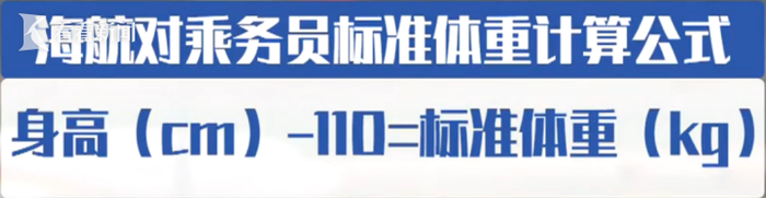 根据网传的这份通知,海航对乘务员标准体重的计算公式为:身高的厘米数减去110,就等于标准体重的公斤数。