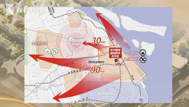目前上海东方枢纽商合区面积虽仅0.88平方公里,但其所依托的东方枢纽是一个空铁联运的超级工程。它毗邻年吞吐量约7000万人次的浦东国际机场,南接年设计客流量达6000万人次的在建上海东站。由此出发,30分钟可达上海市中心,90分钟高铁圈覆盖长三角主要城市,10小时航程可抵达全球多数国家。