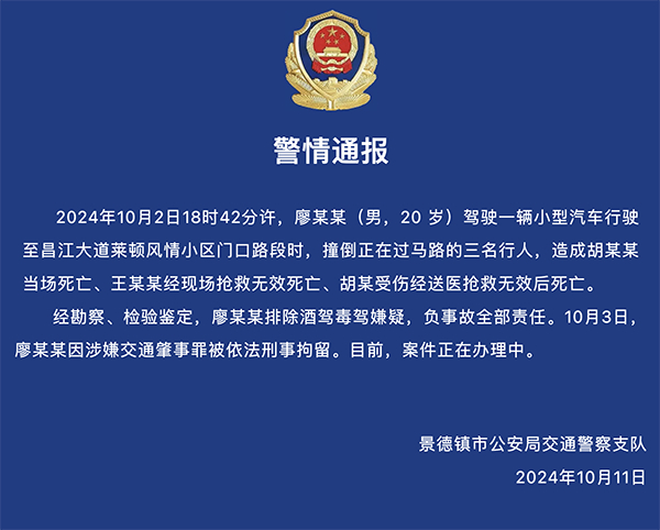 据江西景德镇市公安局官微消息,2024年10月2日18时42分许,廖某某(男,20 岁)驾驶一辆小型汽车行驶至昌江大道莱顿风情小区门口路段时,撞倒正在过马路的三名行人,造成胡某某当场死亡、王某某经现场抢救无效死亡、胡某受伤经送医抢救无效后死亡。
