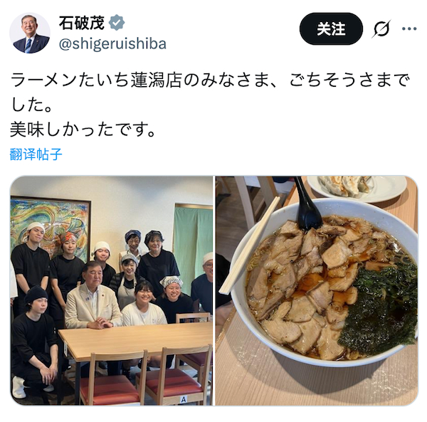 今年7月5日,石破茂曾发布照片自己进入一家拉面店吃面,还展示了自己点的一大碗面,但因为加了太多叉烧肉,被日本网友痛批奢侈。此前他也多次因为吃相差而被批不符合首相身份。