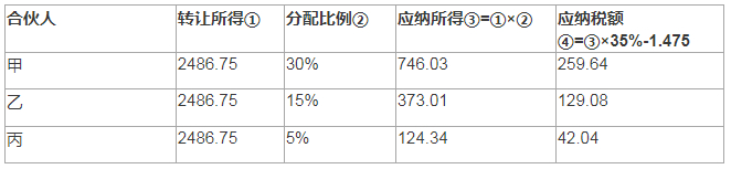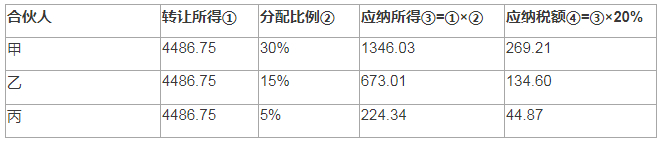 沿用上面的例子,若ABC创投基金总体规模为10亿元,管理费率为2%,则一年的管理费为2000万元,从综合转让所得中扣除,得出转让应税所得为2486.75元。三个合伙的应纳税额计算如下: