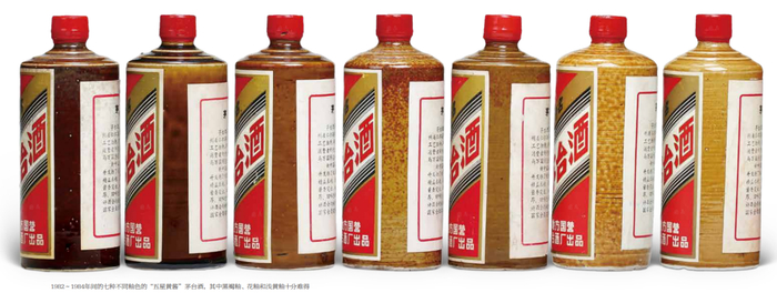 第二种:没有采用乳白色玻璃瓶包装的“五星”贵州茅台酒 ,包含了1983年贵州茅台酒(五星黄釉)、1982-1984年贵州茅台酒(五星七种釉色)、1986年贵州茅台酒(五星酱釉)、1986年贵州茅台酒(五星浅黄釉)四种。