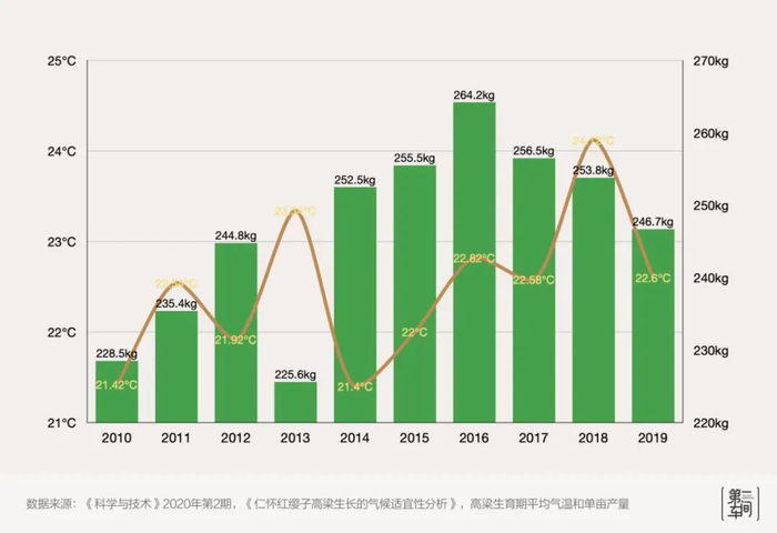 以十年为时间轴,纵观仁怀地区红缨子高粱的生长期,在2013年夏季干旱灾害以外的年份,当地平均温度与高粱产量之间呈现出正相关性,研究发现当平均温度维持在21.5℃至24.0℃时,更有助于提升单位面积的产量,而当地的气候也非常适配红缨子高粱的生长习性。