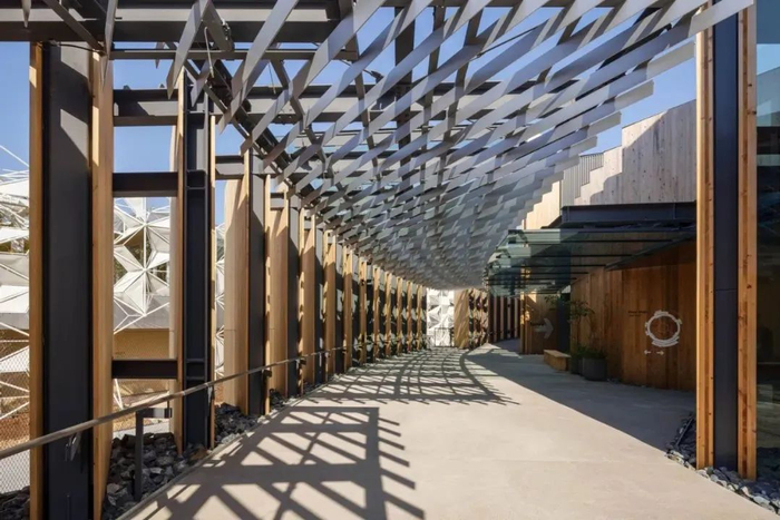 用咖啡豆和木栅栏设计的阿联酋馆入口卡塔尔馆也是由隈研吾建筑设计事务所携手卡塔尔博物馆打造,将卡塔尔与日本的传统工艺完美融合,着重彰显两国与海洋千丝万缕的联系。展馆设计灵感源于卡塔尔传统单桅帆船建造技艺,以及日本精湛的木工传统,使得文化元素在建筑中巧妙交织。