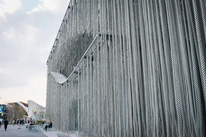 隈研吾设计的葡萄牙馆 吴倩摄阿联酋馆的设计灵感来源于椰枣树,采用90根高达16米的木质柱子构建,这些柱子由约200万片棕榈叶制成,体现了对自然资源的尊重和可持续建筑的理念。设计师用最让人意想不到的材料——农业废弃物和棕榈砾石,打造出这个充满诗意的生态装置。