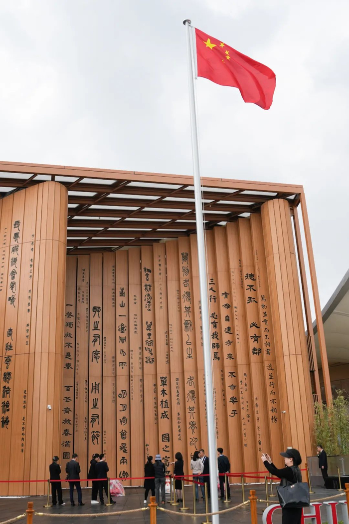 以书简为媒,以技术为支撑,中国馆内共设“天人合一”“绿水青山”“生生不息”三个展区,曲墙引导,步移景异,观众身在其中可以与新一代人形机器人互动、观看以“二十四节气”为主题的大型多媒体动态影像,欣赏数字化动态长卷《耕织图》......整个设计过程都向世界展示中华文化、中国建造、中国技术、中国智慧。而在中国馆所有展品中,最令人瞩目的无疑是“生生不息”展区所展示的嫦娥五号、嫦娥六号带回的月球样品,这是历史上首次实现月球正面、背面土壤样品的零距离对比展示。全球观众在中国馆可通过透镜装置观察月壤独特结构和两者细微差异。38万公里的地月距离在此刻成为文明的标尺与开启未来的钥匙。
