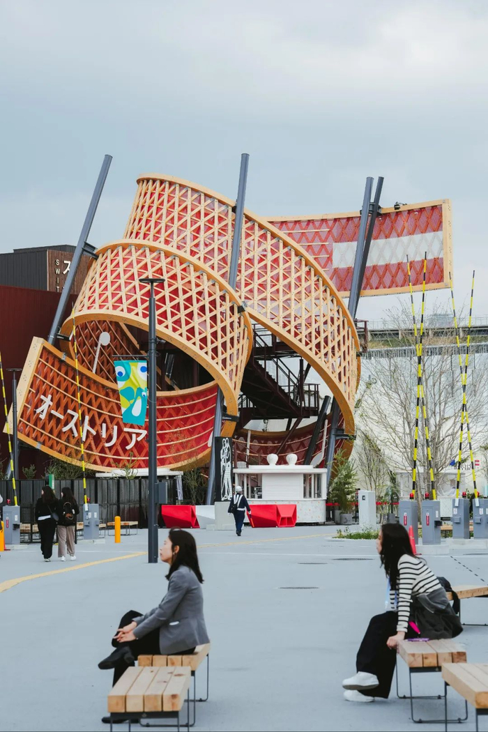 德国馆 图片来源:园景人奥地利占地900平方米的展馆其核心设计是一个由木板条打造的螺旋雕塑,宛如巨大五线谱向上延伸,作为视觉焦点与展览引导,象征奥地利“音乐之旅”。展馆以“奥地利,谱写未来”为主题,借音乐视角重新诠释世博会“为我们的生活设计未来社会”主题。