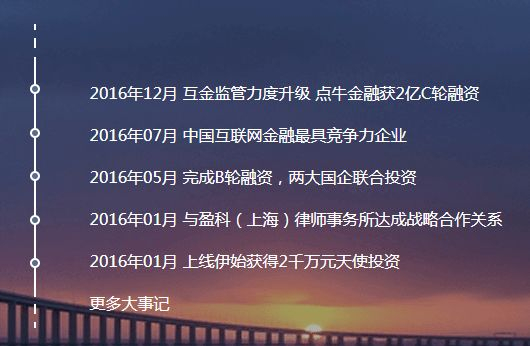 点牛金融官方网站上的“大事记”信息显示,公司自2015年11月创立以来先后获得3轮融资。2016年1月,上线之初获得2000万元天使投资;2016年5月,完成B轮融资,两大国企联合投资;2016年12月,点牛金融再次获得2亿元C轮融资。前后计算,点牛金融上线2年时间内累计获得至少2.5亿元人民币投资。