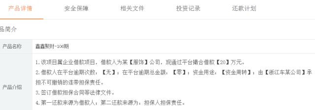 以标的编号为“牛企贷1320期”为例,产品介绍中只披露借款企业为某服饰公司,借款金额20万元,借款企业在平台0逾期,由浙江某公司提供担保。