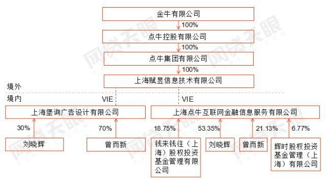 招股书显示,2017年初,点牛金融在开曼群岛设立金牛有限公司作为离岸控股公司。2017年3月,又设立了全资香港子公司点牛集团有限公司,随后6月8日在中国大陆境内成立了全资子公司上海赋昱信息技术有限公司。通过上海赋昱、点牛,以及点牛大股东之间的协议安排,点牛金融控制了点牛93.2%的股权和相关经济利益,VIE