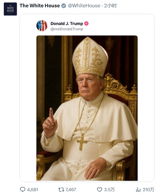 5月2日,似乎还没有死心的特朗普又在他的社媒账号发布了一张他身着教皇服的图片,白宫随后也转发了这张被一些人称为“特朗普教皇”的图片。