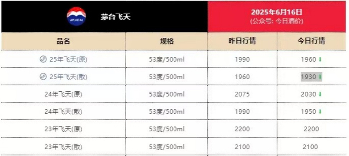 6月11日,在第三方检测平台今日酒价上显示,2025年53度飞天茅台(散瓶)批价达 1990 元 / 瓶,较之前出现下跌;到了6月12日,价格又进一步下滑至1980元 / 瓶 。6月13日,2025年飞天茅台散瓶批发价跌至1960元/瓶。这一价格的暴跌,让整个市场都为之震惊。