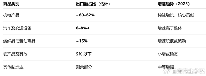 - 传统劳动密集型产品:占出口约17%,主要由民营企业驱动,依然保持了极强的全球韧性。