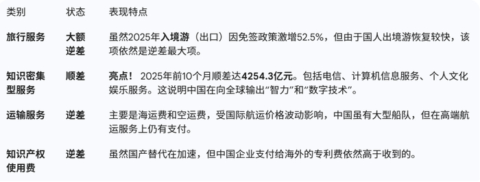 综合来看,旅行、运输、信息服务是出口较快增长的分项;但进口服务(如金融、研发、技术授权、国外旅游、保险服务)仍量大,导致整体逆差。
