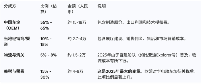 以一辆在欧洲或拉美售价约3.5万欧元(约27万人民币)的中端国产电动车为例,其收入分成大致如下: