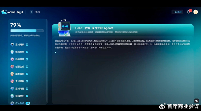 其实Hilight这种“慢”的哲学,就像《思考,快与慢》中写的那样:“一些至关重要的任务只有“慢”才能执行,因为这些任务需要付出努力和控制自我,抑制“快”产生的直觉和冲动。”也就是说,Hilight这款AI工具虽然生成视频不是“秒出”(笔者多次生成制作,平均每个视频用时三十分钟左右),但稍等片刻可以让用户获得更优质的视频。而十多个智能体的厉害,用大白话来说,三个臭皮匠顶个诸葛亮,何况不是臭皮匠,是十多个诸葛亮。可见强大。