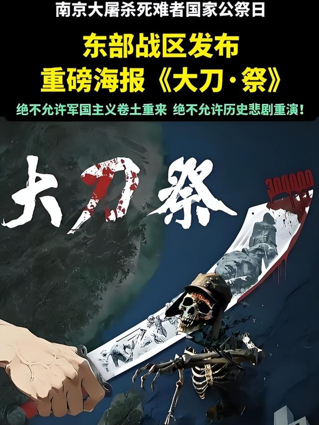 这张海报是由解放军东部战区发表,名为《大刀祭》,画面是一把染血的大刀,直接斩断了戴着二战时期日本军人头盔的骷髅。重点来了,海报之后,东部战区还配了一首诗:“东倭为祸近千年,血海仇深尤眼前。无义畏威心歹斗,长刀所向靖狼烟”。注意了,其中对日本的称呼,变成了“东倭”。