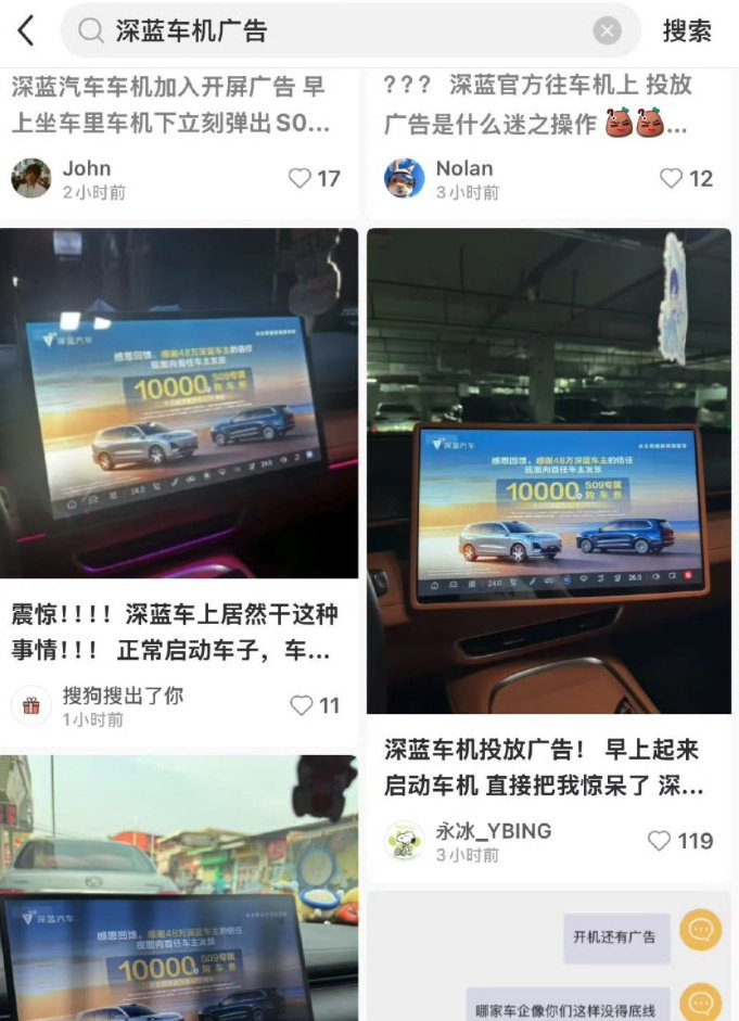 也就是说,如今这个圈子,不管任何品牌几乎任何动作,都能被找出黑点,于是我们看到,法务部取代公关部上位,成了商业文明史上最罕见、滑稽的一幕。但最近一个品牌,着实让小柴没想到,在如此混乱的车圈,他还一次接一次给自己创造黑料,并以「最有效」的方式,把自己的黑料送上热搜,这事儿就挺离谱的。这个品牌柴油们应该猜到了,就是那个最近广告投放非常密集的深蓝汽车,这两天,关于深蓝汽车的多个话题又挂在了热搜上。事情大概是昨天一大早,有大量车主吐槽,自己被深蓝汽车恶心到了!其在未经过车主同意的情况下,在车机大屏上竟然投放起了广告。