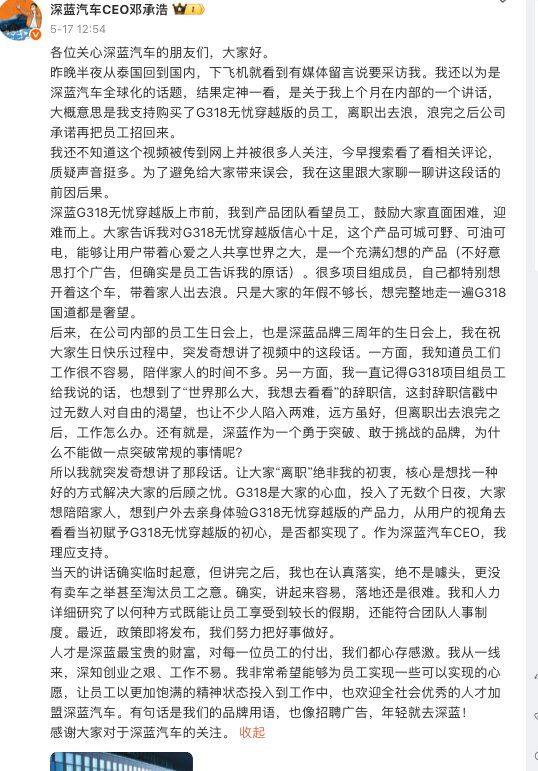 事情大概是,有网友在社交媒体上发布了一段邓承浩在深蓝汽车三周年活动上的讲话视频邓承浩在台上称「买深蓝,给大家离职的机会,出去野一下……然后深蓝再把大家召回来……」