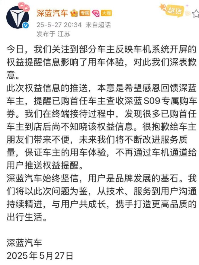 「讲真这个在车机投放广告的昏招真亏的这群人能想出来,前期做好的口碑被这一步臭棋直接搞得功亏一篑」但小柴还是不相信,一个这么大的车企,真不懂这些道理?在强制给车主投喂广告前,他们真没预演过可能发生的争议……?有没有可能,吃瓜群们也会是这场争议中免费的群演、不需要充值的电子生物?相关话题冲上热搜后,深蓝汽车很快发了致歉声明,致歉中,他们还认为这是在感恩回馈深蓝车主。并表示,对此深表歉意。此次权益信息的推送,本意是希望感恩回馈深蓝车主,提醒已购首任车主查收深蓝S09专属购车券。