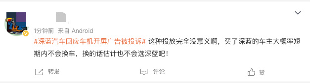而小柴对这一行为不能理解的地方在于,给自己的车主投广告,他到底图啥?明明这48万车主,都是自己的用户了啊!难不成,他们想着车主看到这个广告,会把自己现在的车卖掉、换个新款?就算一个手机壳,也不会这么随意换吧!更别说几十万的车了。就比如有网友表示:「这种投放完全没意义啊,买了深蓝的车主大概率短期内不会换车,换的话估计也不会选深蓝吧! 」