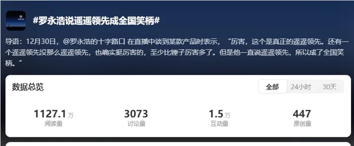 很快,关于罗永浩说“遥遥领先成全国笑柄”的话题冲上热搜第一。