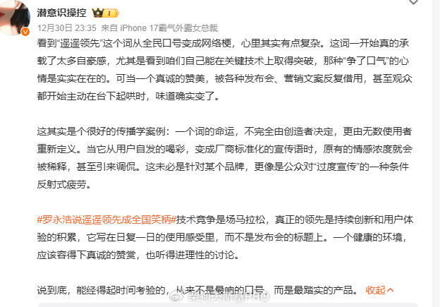 还有博主表示:看到“遥遥领先”这个词从全民口号变成网络梗,心里其实有点复杂。这词一开始真的承载了太多自豪感,尤其是看到咱们自己能在关键技术上取得突破,那种“争了口气”的心情是实实在在的。可当一个真诚的赞美,被各种发布会、营销文案反复借用,甚至观众都开始主动在台下起哄时,味道确实变了。