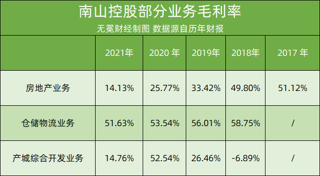 地产业务越来越难挣钱了。2017年,南山控股的地产业务毛利率高达51.12%,但在2021年已低至14.13%。